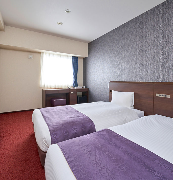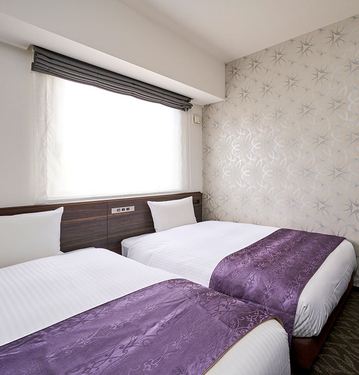 コンパクトな14㎡のお部屋に、少し広めのワイドシングルベッドが2台で、リーズナブルにお泊りいただけるツインルーム。